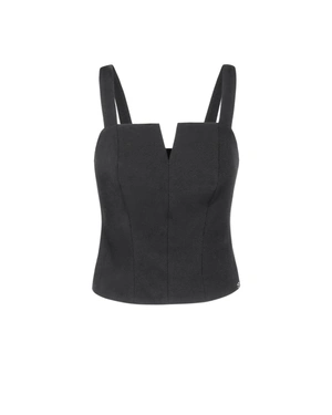 Втален модел, с презрамки, оформящи шевове по дължините, стига до нивото на талията, с елегантен V-детайл на бюста, от район и вискоза, може да се комбинира със съответстващ панталон от колекцията