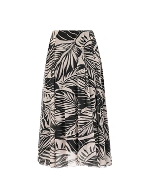 Дълга пола с подчертана талия, с плохи и дължина около средата на прасеца, с тропически десен, материята е много фина мрежа, моделът е с подплата от вискоза.