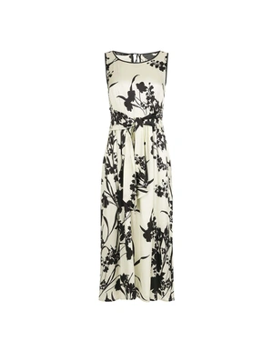 Рокля с обло деколте, без ръкави, с нормално вталяване и леко разкрояване в дължината, около глезена, с текстилен колан за подчертаване на талията и контрастен флорален десен, моделът е с подплата от вискоза. Материята на роклята е сертифицирана вискоза и район и има сатениран финиш.