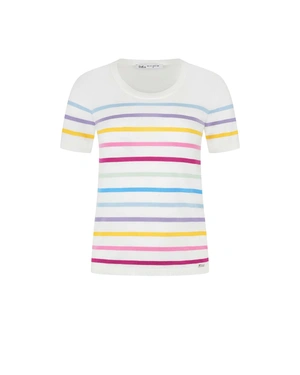 Блуза фин трикотаж, с обло деколте, къс ръкав и нормално вталяване, с многоцветно райе, материята е 100% памук.