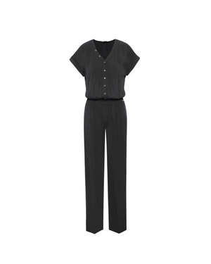 Модел с V-деклолте и декоративни копчета, с къс ръкав, с щрифелка, ластичен колан на талията, нормален крачол, с два джоба