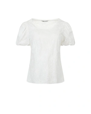 Блуза с обло деколте, къс, буфан ръкав, нормално вталяване, материята е 100% памук и има деликатна бродерия в същия цвят.