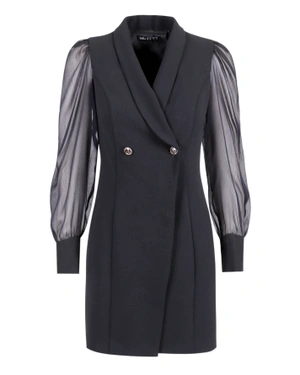 Модел с двуредно закопчаване с копчета-бижута, ревер и ръкави от шифон, с дължина над коляното