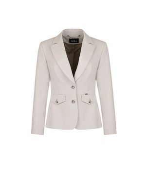 Класическо едноредно сако с ревер, нормално вталяване, джобове с капаци, от памук и вискоза. Моделът е с фино текстурирана материя и може да се комбинира със съответстващи панталони, пола или рокля от колекцията.