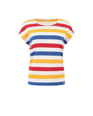 Лятна тениска от фин вискозен трикотаж, десен райе в бяло, червено, синьо и жълто, моделът е с обло деколте, къс ръкав и нормално вталяване.