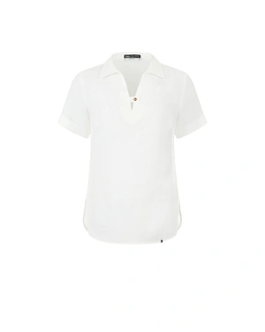 Елегантна лятна блуза от 100% лен, с къс ръкав, нормално вталяване, V-деколте с яка с щрифелка, със заоблени долни краища.