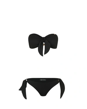 Classic bikini model with mid-rise waist, side ties, and bandeau top with decorative front tie. The model has discreetly shimmering lurex threads and can be paired with a beach dress from the collection.