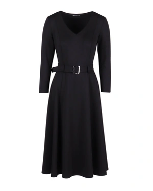 Elegant dress with long sleeves, V-neckline, built-in textile belt with buckle and cut-out hem reaching below the knee, model is 100% cotton