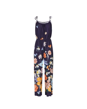 Summer jumpsuit with thin straps and long, straight legs, with elasticated waist definition, featuring a bright floral print on a dark blue background, and made of 100% fine viscose.