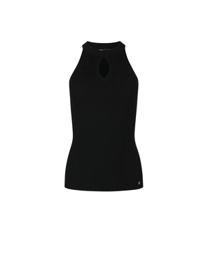 Knit top with a high neckline and teardrop opening, sleeveless, with a regular fit, containing a high rayon content.