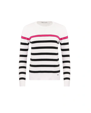 A fine sweater with a high content of viscose, featuring a classic stripe design in white, black and fuchsia. The model has long sleeves, a round neckline, and a regular fit.