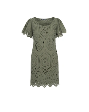 An elegant short-sleeved dress with ruffle details, a round neckline, and a normal fit. The fabric is 100% refined cotton English embroidery.