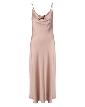 A satin dress with fine, thin straps, a fitted upper part, and a flowing A-line skirt. The length reaches the ankle.