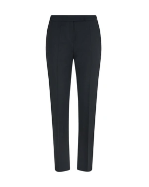 Classic business trousers with straight, pleated legs, containing virgin wool and recycled polyester in the fabric composition. The fabric has slight elasticity, might be paired with matching sleeveless jacket from the collection, the model is 176 cm and wears a size 36