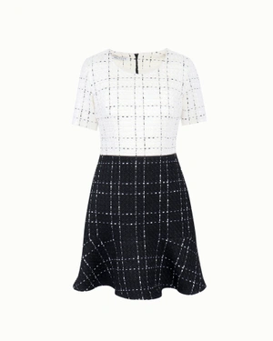 V-neck, short-sleeve, above-the-knee length, fit and flare, two-tone wool blend tweed dress. This item contains wool of guaranteed origin, mulesing-free.