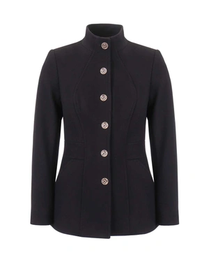 Virgin wool, long sleeve, regular fit, single breasted and high collar, with leather edging to structure the silhouette and emphasize the waist, lined